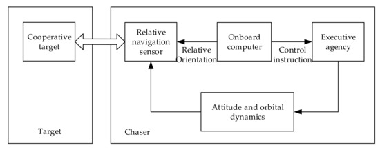 As the only natural satellite of the Earth, the importance of the Moon to the Earth and mankind is self-evident. The Cislunar environment is a promising location for space exploration. Apollo carried out eight crewed manual lunar orbital rendezvous and docking missions, in which human intelligence played an important role in rendezvous monitoring and docking [1]. Space rendezvous and docking technology refers to the technology in which the chaser spacecraft and the target spacecraft meet at a certain position on the same orbit at a certain time, and then are structurally connected. Compared with traditional rendezvous and docking relying on ground control, autonomous rendezvous and docking can reduce the work intensity of ground personnel, eliminate the influence of signal delay and avoid external interference. Autonomous rendezvous and docking mean that the two spacecraft rely on their own navigation, guidance and control systems to complete the entire process of rendezvous and docking without the intervention of personnel on the ground or in the spacecraft [2,3]. An autonomous rendezvous requires the formulation of high-precision, high-reliability and high-safety rendezvous strategies, and higher requirements for the performance and intelligence of the guidance, navigation and control system [4,5,6]. The composition of an autonomous rendezvous and docking system is shown in Figure 1.
