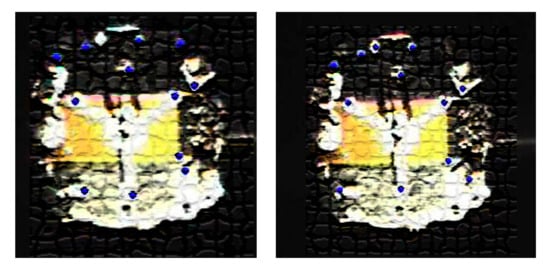 - In the construction stage of the safety knowledge base, the features on the images collected by the surveillance cameras are clustered, and the feature cluster centers are matched with the features on the simulated images. Then, the matching results are manually detected, and the false matches are deleted. Since the safety level corresponding to the simulated image can be obtained from the dynamics model, the label for the manually detected features can be obtained, which is the same as the matched simulated image. With the features and label, we can construct several training samples. Then, decision tree methods are used to construct a knowledge base. An example of the feature points is shown in Figure 3;