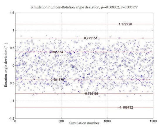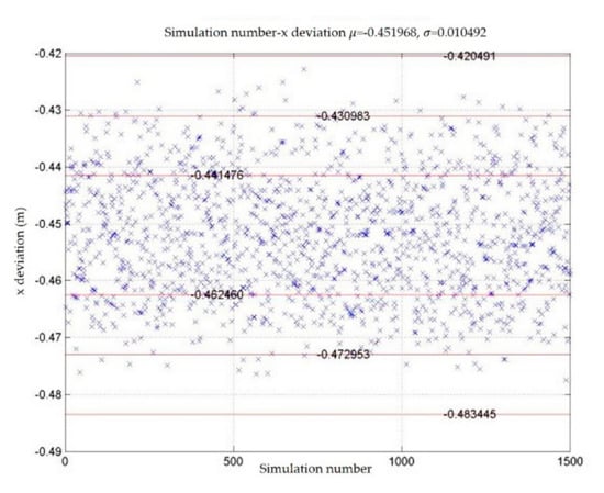 The spacecraft dynamics model is used to generate the simulated trajectory sequence and the deviation of the rendezvous and docking result. The deviation of the rendezvous and docking result includes three displacement deviations and three attitude angle deviations. Assuming that these six random variables obey the normal distribution of different parameters, the six deviations are set to four levels according to the standard deviation of their distribution. We obtain 1500 sets of simulated rendezvous and docking deviation results by using the spacecraft dynamics model to simulate the rendezvous and docking process 1500 times. Figure 4 and Figure 5 show the deviation of displacement in the x direction and the rotation angle as examples. Each blue cross represents the deviation of one simulation result. The mean and standard deviation of each deviation are shown in Table 1. In the table, , and denote the deviations of the movements in the direction of x, y and z, respectively, and , and denote the deviations of precession angle, nutation angle and rotation angle, respectively.