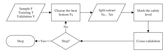 The safety judgment knowledge base is constructed using an Ordinary Binary Classification Tree (OBCT). The sample set is divided into a training set (90%) and a validation set (10%), and a cross-validation technique is used as the stopping criterion in the training of the decision tree. The algorithm flow of the training of the decision tree is shown in Figure 6. We continuously select the best features to split the node until the average classification error of all validation sets is minimized. Finally, we obtain a decision tree with a depth of 50. During training, the maximum entropy impurity reduction (information gain) strategy is used to select the optimal feature components. The entropy impurity at node of the decision tree is , and the information gain obtained by selecting features is , as follows: