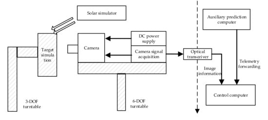 The target docking surface model is installed on the target platform, and the camera is installed on the chaser platform. The image signal is transmitted to the control computer through the optical transceiver, and the control computer encapsulates the received video data in real time by simulating the flight control network protocol and then uses the local area network to forward it to the auxiliary prediction computer. In addition, in the experiment, the incident angle of sunlight under the real lunar orbit is simulated, and a solar simulator with a three-degrees-of-freedom servo is used to generate parallel light to illuminate the entire target plane.
