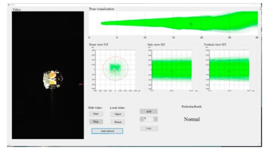 The data display and human–computer interaction interface is shown in Figure 8. The data display areas show the trajectories of the target in different views. When a rendezvous and docking operation ends (regardless of whether it ends normally or abnormally), the 6DOF rendezvous and docking deviations are obtained, and a sample is also generated. In the process of rendezvous and docking, the mathematical simulator outputs six degrees of freedom at each moment. According to the small hole imaging model and the internal parameters of the camera, a simulated image is generated from the mechanical model of the target end face. is then obtained by extracting features from. By using Equation (2), the rendezvous and docking deviation are mapped to a safety level. With the features and the corresponding safety level, we can construct the training samples to train the decision tree. The whole process realizes the transformation from image to rendezvous and docking safety level . At the test experiments, the surveillance camera takes an image of the target, as shown on the left side of Figure 8, and the decision tree predicts the safety level of the rendezvous and docking, which is displayed in text in Figure 8. The four safety levels mean “Normal”, “Early Warning”, “Warning” and “Abnormal”, respectively. In order to visually display the real-time status of the rendezvous and docking, the position of the target is shown in Figure 8 in different views with a red cross.