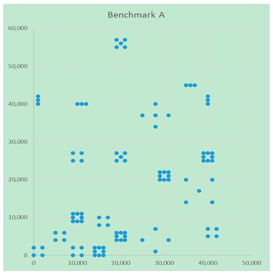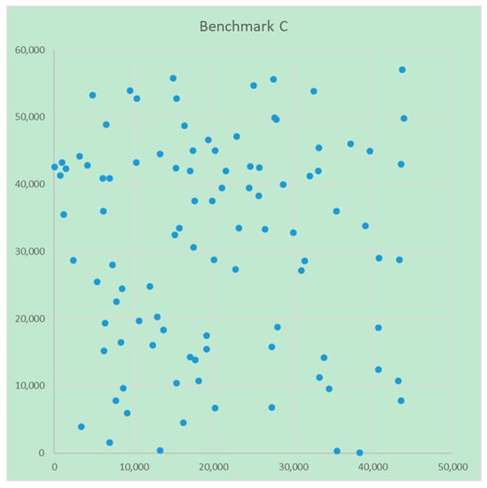 For benchmark C, values of positions of points are generated by the Excel RANDBETWEEN function in the range 0 to 45,000 for x coordinate, range 0 to 60,000 for y coordinate, for weight in range 1 to 25 (Figure 3). For benchmark C, the reference solution is calculated using the metaheuristic method: the lowest value of 300 calculations on three HW configurations is used. Table 4 shows the reference values for the benchmark instances.