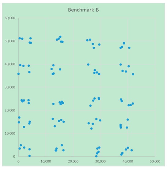 Benchmark B is a combination of twenty randomly generated groups of five points, their position in the area is designed so that there is no mutual influence (Figure 2). The optimal center positions cannot be directly calculated. For benchmark B, the reference value was obtained in three ways: