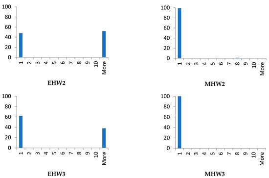 In each method, 100 different results were obtained for benchmarks A, B, and C; the difference between the minimal and the reference values are statistically evaluated using histograms. The intervals are designed in the range of 1–10% of the reference value. The histogram shows the frequency of occurrence of the obtained values in each interval. From the graphs it is possible to assess how accurate the method and influence of the hardware is, see Figure 4, Figure 5 and Figure 6.