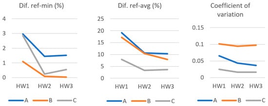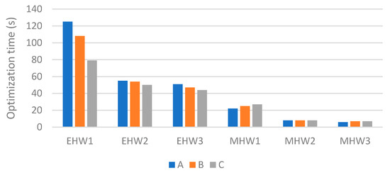 The influence of benchmark topologies and hardware (only for evolutionary algorithm) on selected parameters (Dif. ref-min (%), Dif. ref-avg (%) and coefficient of variation) can be seen in Table 12, Table 13 and Table 14, and in the graph in Figure 7. The last monitored parameter is the average optimization time in Table 15 and Figure 8.