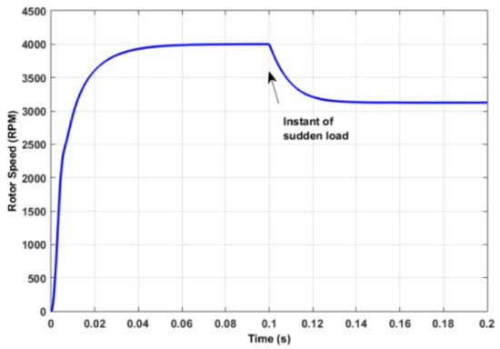 Figure 2 demonstrates the open-loop dynamic response of the BLDC motor drive system model. The no-load rotor speed stabilizes at 4000 RPM through 0.04 s. A fixed 50% of rated torque was applied on the motor shaft at time 0.1. Due to the sudden load, the corresponding rotor speed will be reduced to 3200 RPM. This behavior of the BLDC model indicates that the model was developed correctly.