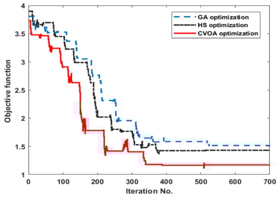 The convergence curve for GA, HS, and CVOA.