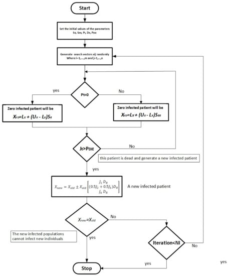 From Equations (22) to (24), we can note that when J1, J2, J3, and J4 close to zero the Xnew = Xold to achieve the stop criterion (the newly infected populations cannot infect new individuals). Also, the DR parameter is randomly determined by the immunity of individuals which is an important factor to estimate the newly infected individuals.