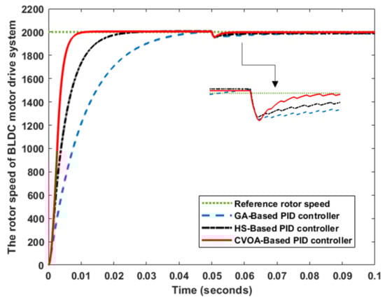 Figure 7 shows that the CVOA-based PID controller can track the reference speed rapidly compared to the GA-based PID controller and HS-based PID controller. Besides, the CVOA-based PID controller can absorb the sudden load disturbance at an instant of 0.05 s in a short time.