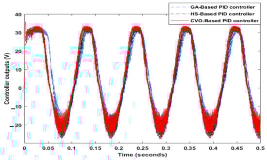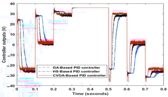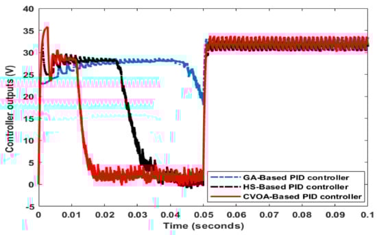 Figure 8 demonstrates the corresponding controller output of each control technique. It is clear that the CVOA-based PID controller can detect rapidly any change in BLDC motor dynamic. In addition, the CVOA-based PID controller has a step change value at a sudden load test.
