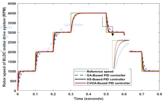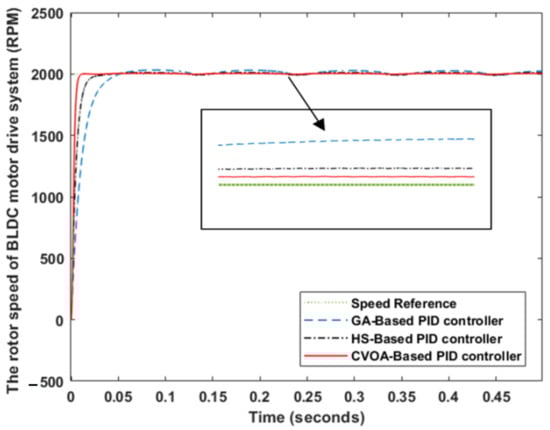 Figure 12 displays the dynamic performance of each control technique. It can be noted that the CVOA-based PID controller can follow accurately the reference speed of the BLDC motor. At low reference speeds, the tracking accuracy is high while the error between the reference and actual speed will increase for high reference speeds.