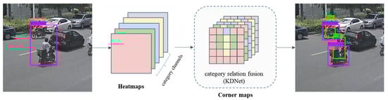 For many years, researchers in the computer vision field have believed that contextual information or relationships between objects contribute to object recognition [18,19,20,21,22]. The basic idea is to take the relational features of an object as the weights of the apparent features of other objects in the image and measure them. This method validates the advantages of modeling objects and creates a general module, which can improve the accuracy of the anchor-based algorithm on the original basis. However, as the anchor-free algorithm does not have the design of an anchor, it is unable to generate a lot of proposals representing the appearance feature of the object and cannot directly measure the relationship between heatmaps. Therefore, it is a very challenging problem to explore the target relationship in heatmaps. In the literature [22], there is strong evidence that object relations can be used to support various visual tasks (e.g., image recognition and object detection). Inspired by the relation network, KDNet proposes a new knowledge-driven network to solve the relationship between objects, shown in Figure 1. The two objects are classified as the same object because of the use of an anchor-free network. The reason for false detection is that in the heatmaps, the keypoints of each object are an independent prediction, and there is no correlation. In the task of object detection, different objects may have some kind of connection. Therefore, we used a knowledge-driven network to establish the relationship between the keypoints of each object and fused the information between heatmaps channels to generate the corner maps that can enhance the characteristics of the detected object.