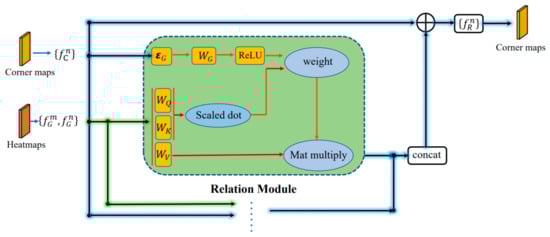 Relation module. The relation module borrows the idea of its object relation module (ORM) to model the corner features and geometric features of keypoints. Firstly, the respective weights and are calculated according to two characteristics, and the parameters indicate the weights of the local features and geometric features of the corner points, respectively. The total weight (Equation (9)) is obtained from the weights of the two features and (Equations (11) and (10)), and then each relation module is weighted according to the total weight of the m-th keypoint to the current keypoint.