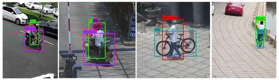 To better demonstrate the correctness of our approach, we constructed a new dataset called RIDER to evaluate our method. The dataset came from real video surveillance scenes, covering many scenes, such as night, sunny, cloudy, and foggy scenes. Moreover, there were many objects to be detected with different scales. Most importantly, the relationship between categories was obvious, which was very suitable for the test difficulty of this work. To guarantee that the distribution of training, validation, and test data were similar, we randomly selected 46,449 images as the training set and 5162 images as the test set. RIDER contained five categories: Rider, Motorbike, Bike, Helmet, and Pedestrian, and the number of images per subclass is given in Table 1. The labeled Rider is characterized by a person driving a two-wheeled vehicle, and the entire body is visible (green rectangles); Motorbike is characterized by a two-wheeled vehicle, and the tire part is similar to a bike (pink rectangles); Bike is characterized by a simple structure and a narrow width (blue rectangles); Helmet is a safety helmet, which is elliptical (purple rectangles); Pedestrian is characterized by a person walking on the road (red rectangles). Example images are shown in Figure 4.