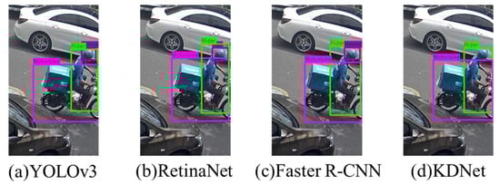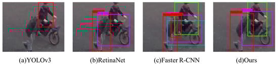 First, we analyzed the results on Pedestrian, Rider, and Motorbike. Figure 5 shows the results of a typical scene that were obtained using four methods. As shown in Figure 5, the object in the image is ambiguous and there is occlusion; it is very challenging to extract the object region. Figure 5a–c shows the detection results of YOLOv3 [33], RetinaNet [34], and Faster-RCNN [8], respectively. Note that YOLOv3 [33] and RetinaNet [34] failed to distinguish between the pedestrian and the rider. As for the RPN-based method, the number of proposals was relatively large; thus, Faster R-CNN [8] can effectively detect objects, while the byproduct is a large number of false-positive detections. In contrast, our proposed method in this paper combined the geometric features and corner features between objects and successfully detected objects while using knowledge-driven methods to effectively avoid false detection.