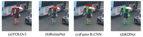 The second set of experiments was Bike and Rider, shown in Figure 6. It can be seen that this task was challenging, because the objects to be detected were very close. In this complicated background, YOLOv3 [33] missed the objects, and the Faster-RCNN [8] and RetinaNet [34] algorithms not only failed to detect the right objects, but also generated a large number of false bounding boxes. However, KDNet (Figure 6d) combined the information from features that can help the detect the object more accurately. This shows that adding the category information in the geometric feature can increase the semantic information between the objects. After the corner feature and the geometric feature were merged, it effectively avoided false detection of missing parts.