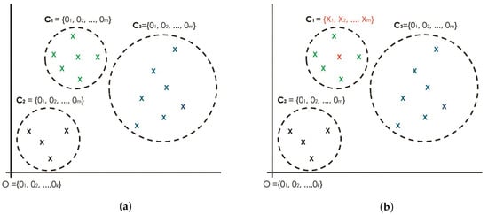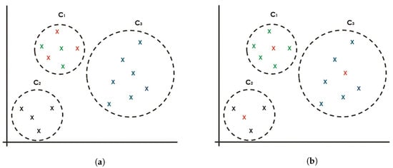 Figure 1 depicts two scenarios that may happen in the random seeding method. Consider three clusters and with objects colored in green, black, and blue, respectively, and the seeding of k-objects () that are taken from the objects randomly, represented in red. It is a well-known problem that many cases result in the worst-case scenario shown in Figure 1a, in which the three objects are seeded from the same cluster (the green cluster). However, it may also result in the best-case scenario shown in Figure 1b, in which the three objects are seeded and represented by each cluster. These scenarios may lead to either poorer clustering results (the worst-case scenario) or better clustering results (the best-case scenario). Therefore, for every run, the clustering results may vary, ranging from the worst-case to the best-case clustering performance.