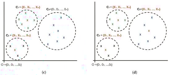 Proposed seeding approach with zero multidimensional spaces seeding regarding k-AMH numeric procedure. (a) Three clusters ( and initially refer to the same point: the origin. (b) Two clusters ( and initially refer to the origin, whereas has obtained the final object using k-AMH numeric procedure. (c) Remaining cluster initially refers to the origin, whereas has obtained the final object. (d) Final k-combination objects. Note: This concept will be implemented in the k-AMH framework where the process of finding the final medoids (Cluster center) involves checking for each object and replacing it, if the cost function is minimized. For the case above, the final cluster centers for , will be obtained first, followed by , and finally . The final cluster centers denoted as , and are actually, and eventually, represented by the arbitrary objects X owing to the k-AMH procedure.