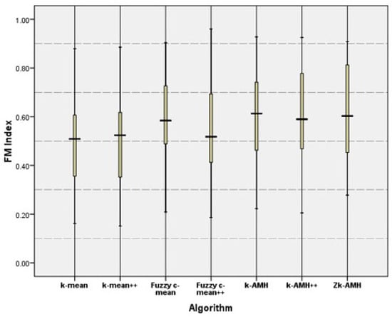 Figure 3 shows an initial comparison of the seven algorithms for the combination of the eight datasets considered. These results demonstrate that the Zk-AMH algorithm is certainly competitive and comparable to its counterparts, the k-means, k-means++, fuzzy c-means, fuzzy c-means++, k-AMH numeric, and k-AMH numeric++ algorithms. Overall, the Zk-AMH approach produced the highest minimum scores and marginally lower maximum scores than the other algorithms. Moreover, the box plot for the Zk-AMH algorithm is larger than those of the other algorithms, particularly in the third quartile. It indicates that the Zk-AMH algorithm attained scores that were greater than the median score and close to the maximum score as compared to the other algorithms.