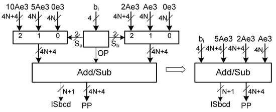 The output of the partial product reduction is in BCD/excess-6 format. A final BCD/excess-6 to BCD converter is required if the result in a pure BCD format is needed. The difference between both multipliers is the partial product generator and the required multiples. In Figure 7a, multiplier 1 uses the partial product generator based on multiples Ae3, 2Ae3, 5Ae3 and 10Ae3 (obtained directly from multiple Ae3), and in Figure 7b, multiplier 2 uses the partial product generator based on multiples 2Ae3, 4Ae3 and 5Ae3.