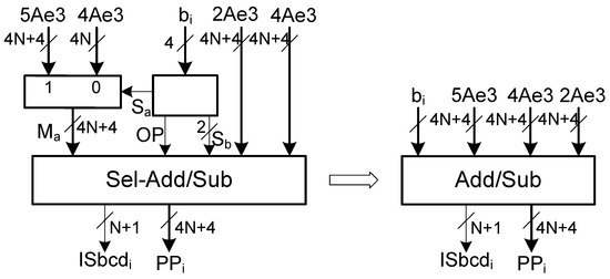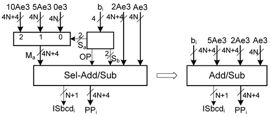 Partial product reduction adds the N partial products {} with left shifted by i decimal places. Formally the addition of partial products is calculated according to Equation (17).