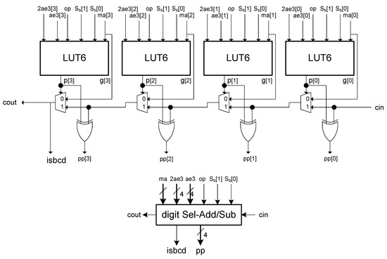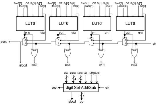 The adjustment of the operands and their addition were designed with a single level of LUT-6 and the carry-chain of the FPGA. The expressions of the generate and propagate signals of a single digit adder are as follows [45]: