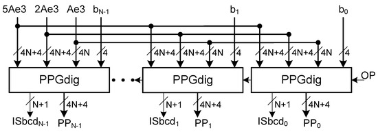 The complete partial product is obtained with a chain of these single-digit blocks. The generated partial products are in BCD/excess-6 format. Therefore, each partial product output consists of N + 1 BCD/excess-6 digits, , and N + 1 bits, , one for each digit, indicating if the digit is represented in BCD or excess-6.