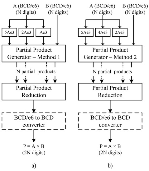 A different approach for decimal multiplication considers binary multipliers as the base arithmetic unit [33,34,35,36]. This permits using binary multipliers that are faster and may already be available in the system. Also, it implements both binary and decimal multiplication in a single module. The method first converts the BCD operands of the multiplication to binary. The converted operands are then multiplied using the binary multiplier. The binary product is then converted to BCD. The main drawback of the binary-based method is the large overhead introduced by the converters [35,37]. A balanced solution was proposed in [34] that subdivides the multiplier and the multiplicand into smaller blocks and applies the method to each of these sub-blocks. The partials are then aligned and added using decimal adders to generate the final product.