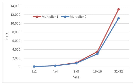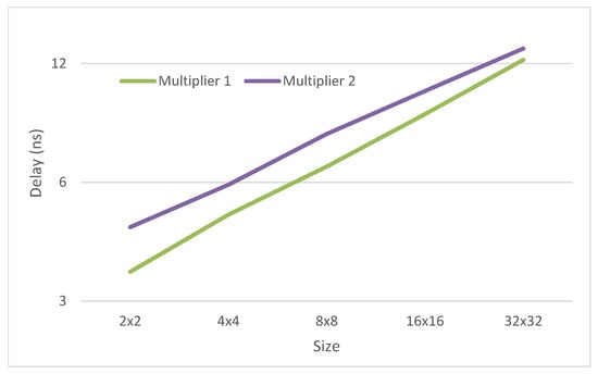 As can be observed from the results, multiplier 2 is 18% smaller than multiplier 1 for the 32 digit multiplier. This difference reduces for smaller multipliers. On the other side, multiplier 1 is 30% faster than multiplier 2 for the 2 digit multiplier. This difference reduces for larger multipliers (see Figure 8 and Figure 9).
