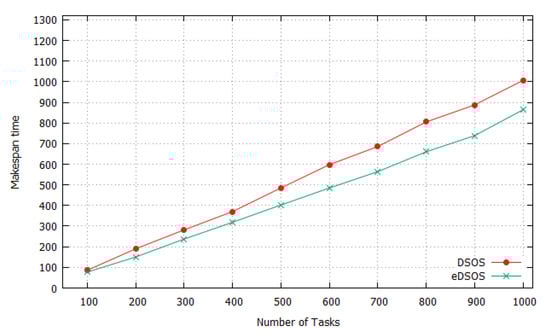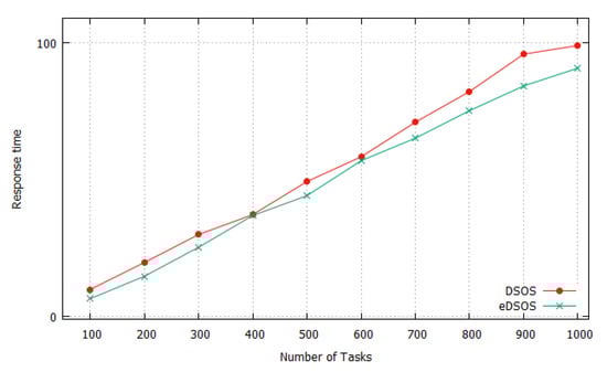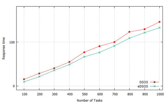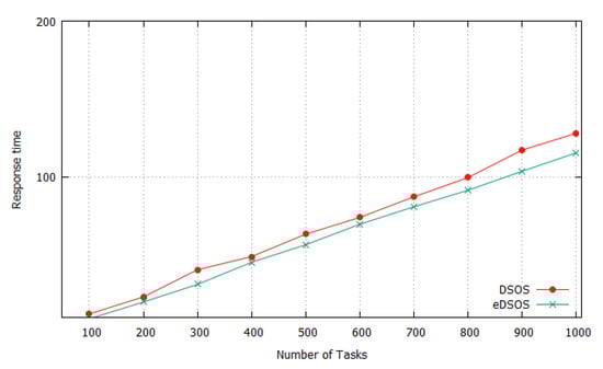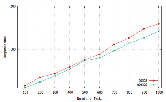 The average makespans for executing instances of tasks 10 times by utilising DSOS and eDSOS can be seen in Figure 3, Figure 4, Figure 5 and Figure 6. All of the figures show a minimisation of the makespan by using eDSOS in most situations, especially in some task instances, such as with 100 or more. In addition, the percentages by which eDSOS improved compared to DSOS for different dataset instances are summarized in Table 5, Table 6, Table 7, Table 8, Table 9, Table 10, Table 11 and Table 12, showing that the improvement of the performance of eDSOS compared to DSOS increases as the search space expands. Figure 7, Figure 8, Figure 9 and Figure 10 indicate the response times of the VMs with DSOS and eDSOS; the figures demonstrate that eDSOS’s response time is minimal for large-scale problem instances.