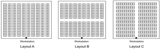 The three most common layouts in traditional design problems are shown in Figure 1 (similar description see Pohl et al. 2009 [33]). Layout A has picking aisles perpendicular to the front wall but without a cross-aisle inserted into the picking space. In layout B, picking aisles are perpendicular to the front wall with a middle cross-aisle, while in layout C, picking aisles are parallel to front wall with a central cross-aisle. Obviously, the layout optimization problem is about the arrangement of storage locations and aisles, and is often evaluated by expected travel distance for pickers. Pohl et al. (2009) [33] developed expected travel distance expressions based on any two locations in the storage area for dual-command operations and used them to analyze the three common warehouse designs. Their results indicated that layout C is the best design, which is least commonly found in practice. Caron et al. (2000) [32] present an analytical approach for layouts A and C (with workstations at central and corner points) to calculate the expected travel distance with N picking locations using a traversal routing strategy. Both COI-based and random storage policies are considered. The difference in travel distance between layout A and C may be greater than 60%. Moreover, the results show that layout decisions seem to be strongly affected by decisions concerning batching and storage policies. For layout B and its variants (with more than one block), Roodbergen and Vis (2006) [34] developed a model capable of finding the best layout for one block order-picking area, with S-shaped and largest-gap routing policies. Based on this work, Roodbergen et al. (2008) [35] extended the research and formed a layout optimization model that can consider layouts with any number of blocks and aisles using a statistical estimate for average travel distances with random storage and S-shape routing. All these layouts consider only one workstation (which is also referred to as a pickup and deposit point, P&D), and Roodbergen and Vis (2006) [34] have proven that the optimal location of the P&D is in the middle of the front cross-aisle. Owing to the characteristics of the manual order-picking system, such as pickers having to visit more than one storage location during a tour, the S-shaped or traversal routing policy is commonly used when calculating travel distance.