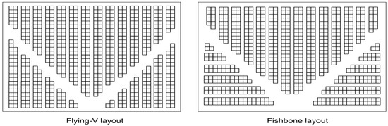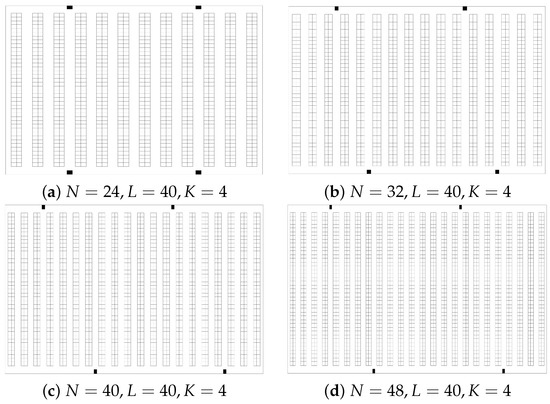 To implement the above integer programming model, we should first generate candidate workstation set , i.e., derive the coordinates of candidate workstations according to the interpretations in Section 3 (more specifically, Figure 3 in Section 3.1 for traditional layout and Figure 5 in Section 3.2 for flying-V layout). Then, calculate the shortest distance from each pod to every candidate workstation, i.e., generate travel distance matrix based on Equations (9)–(16). As input parameters and K are well prepared, the proposed optimization model can be successfully implemented and solved by optimization solvers, for example, CPLEX and Gurobi.