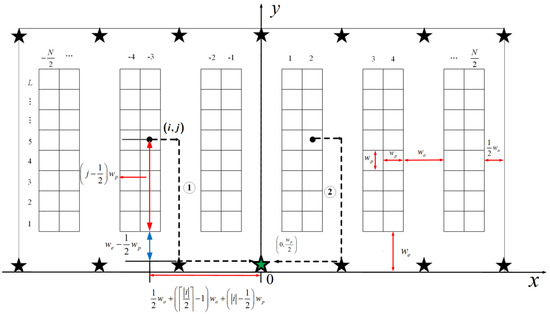 Following the same assumption as [10], we specify that each pod must take the shortest path if it will be delivered to a candidate workstation. In addition, the distance equations under traditional layout are similar to those in [10]. Figure 3 illustrates a sketch map of a traditional warehouse layout. The number of rows and columns are L and N respectively. Without loss of generality, N is supposed to be an even number and . We define a coordinate system where the origin locates in the center of the rectangle bottom edge. As shown in Figure 3, a pod is denoted by , which represents that the pod is in row , column . The width of each picking aisle is , and the width of each pod is . We only consider two cross aisles at the top and bottom edges with width . We assume that there are candidate workstations (stars in Figure 3), and each is denoted by , (where is the set of candidate workstations). The center of a workstation is away from the edge. Each pod is associated with a point by its geometric center, denoted by in the coordinate system that: