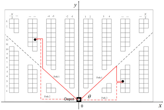 In the flying-V layout, two cross aisles are inserted into the warehouse, as shown in Figure 4. The inserted cross aisles begin at the bottom center, extending to the right-most and left-most edges with angle and , respectively. Owing to its complexity, we will first demonstrate the expression of robot travel distance with a single workstation located at the center of the bottom edge. There exist two possible candidate paths if we try to deliver pod to the workstation under a flying-V layout, as shown in Figure 4 (herein, we have according to the description in Section 3.1) (Similar descriptions of possible paths in flying-V layout see [50]). Path one (i.e., the solid red line) heads down (or up) from the current position along the corresponding vertical aisle, reaching the angled cross-aisle, and then travels along the angled cross-aisle, and finally arrives at the workstation. Path two, which is identical to the delivery path in a traditional warehouse, moves down along the corresponding vertical aisle, travels horizontally along the bottom aisle, and finally reaches the workstation. We assume that each pod is delivered from its current position to the workstation along the shortest path. Again, we ignore the error caused by the even column index. Thus, the distance of path one can be given by (The exact distance formula of path one is . To simplify the calculation, we approximate by . Such approximation is reasonable, because the difference between two formulas can be given by , where , and in this work. Please note that under the above conditions, which is negligible compared to , and thus, we replace with . As for multiple workstation cases, the above conclusion still holds after similar analysis. For other distance calculations, we also adopt similar approximation method, see Table 2):
