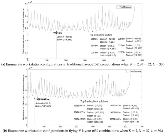 One may question whether we can enumerate all the possible workstation configurations given the knowledge that number of workstations may be not that large for a single warehouse in practice. To verify this, we set up an experiment using a warehouse with width and length , 960 pods or about 1500 m. Figure 6 shows the total distance with possible workstation combinations for both traditional layout and flying-V layout (). It takes about one minute of CPU time to compute the the travel distances from each pod to all candidate workstations for traditional layout and four hours for the flying-V layout. If we consider using more workstations, or a larger warehouse, the computation workload will increase sharply. For example, if we select eight workstations in the same warehouse, there are combinations for the traditional and combinations for the flying-V layout. Therefore, the enumeration method cannot work in this case.