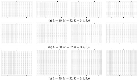 As part of the experimental results, the optimal solutions for instances when are shown in Figure 7; more layout figures can be referenced in Appendix A Figure A1. The black solid blocks represent the workstations and each square represents a pod. Using the 4-workstation case as an example, it is interesting to see that the workstations on the top and bottom sides are not symmetric; in other words, the quadrangle consisting of the four workstations is not a rectangle, but a parallelogram, which is counter-intuitive. As the number of workstations increases, the shape has the tendency to turn from a parallelogram to a rectangle.