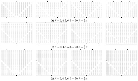 To conduct the experiments, we design instances for traditional and flying-V layouts with different parameters, including warehouse width, length, and angle of the angled cross-aisle (i.e., ). The parameters are set as shown in Table 3. We assume the pod width as unit length, i.e., . We also set the width of the picking aisle, the top, bottom and angled cross-aisle (in flying-V layout) as 2, i.e., . Typically, the storage space for a pod is 1 × 1 m in an e-commerce warehouse. Therefore, the largest scale in our experiments is comparable to a warehouse with almost 18,000 m (if , then the warehouse area is m), which is big enough for a single warehouse in the industry. Please note that constraint Equation (20) restricts the number of workstations (K) selected in the optimal solution, and hence we can fix the workstation number easily.