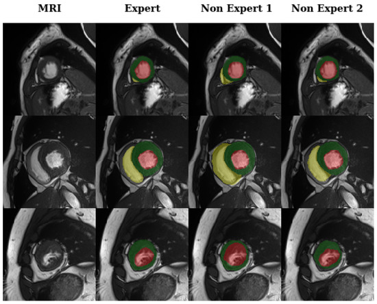 This idea was tested on cardiac cine-MRI segmentation. To this end, we had two non-experts labeling cardiac cine-MRI images and compared the performance of neural networks trained on non-expert and expert data. The evaluation between both approaches was conducted with geometric metrics (Dice index and Hausdorff distance) as well as clinical parameters, namely, the ejection fraction for the left and right ventricles and the myocardial mass.