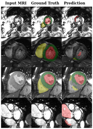 Examples of bad output segmentation on the M&Ms data set for the left ventricle, right ventricle and myocardium.