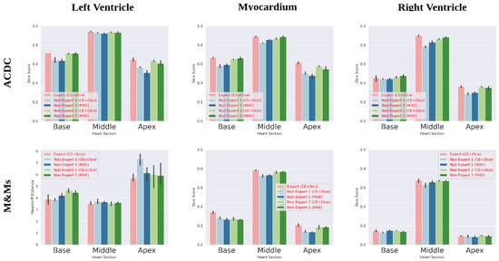 Our experiments also reveal some interesting results on the M&Ms data set, a data set with different acquisition settings than ACDC. In that case, we see that the gap in performance between the expert and the non-expert decreases substantially. For example, when comparing the Non-Expert 1 results with MAE+Dice loss and those from the expert annotation, we see that the Dice difference for the RV decreases from a 6% on the ACDC data set to a mere 4% on the M&Ms data set; overall, the results of Non-Expert 2 are similar (and sometimes better) than those of the expert.