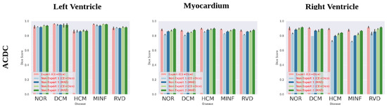 Dice score on ACDC per disease. NOR: Normal, DCM: Dilated cardiomyopathy, HCM: Hypertrophic cardiomyopathy, MINF: Myocardial infarction, RVD: Right ventricle disease.