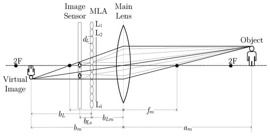 Plenoptic or light-field camera collects the light-field information of a scene by employing specialized design. Unlike the conventional camera, plenoptic camera captures light as well as associated direction information. It contains a micro-lens array (MLA) between the main lens and the image sensor [], as depicted in Figure 1. Whereby represents a micro-lens in the grid with a unique identifier ; corresponds to the diameter of the micro-lens, is the focal length of the main lens, is the distance of the object from the main lens and is the distance between virtual image and the main lens. Moreover, is distance between MLA and the main lens, and is the distance of the corresponding virtual image from the MLA, is the distance between MLA and the image sensor. The image is formed behind the image sensor, hence it is virtual.