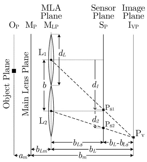In an MLA of the plenoptic camera, micro-lenses are arranged in a specific order, such as hexagonal. Due to such formation, a classic stereo camera paradigm can be considered for a pair of adjacent micro-lenses to calculate the depth of the scene, as shown in the Figure 3. Using the thin lens model, plenoptic camera is represented in 2D space as parallel planes: object plane , main lens plane , MLA plane , sensor plane and image plane . Two micro-lenses project points onto that is placed at the distance of from the . Rays from and intersect at virtual point onto the . Moreover, refers to the distance onto the from the principal axis of the respective , and b represents the baseline distance between the micro-lenses. The triangulation of this setup results in: