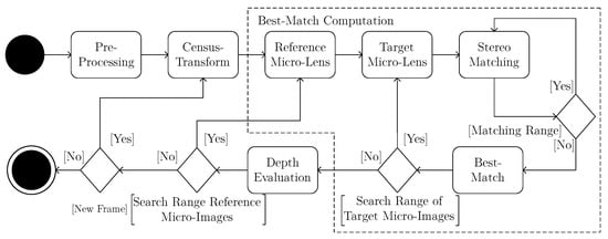 These equations show that the object distance is computed by estimating virtual depth which subsequently depends on the points projected by the micro-lenses. These calculations show how the final depth is estimated, which is achieved by a series of steps. Therefore, modified algorithm is divided into several processing steps: pre-processing, non-parametric transform, best-match computation and consequently depth-evaluation, as depicted by a UML activity diagram in Figure 4.