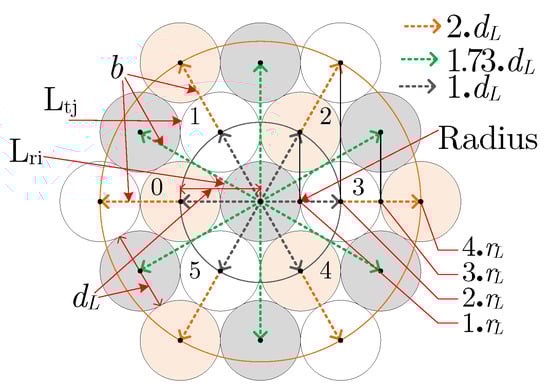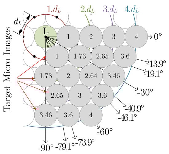 In proposed modified algorithm, selection of a pair for the stereo-matching depends on the baseline distance b. The different b with neighboring target micro-images from reference micro-image in an MLA is shown in Figure 9. During the stereo-matching process, to find the correspondence, needs to be correlated with several which are placed at b distance from the respective . Whereby b is calculated by Equation (10). The values inscribed in the micro-lenses refer to the of the respective baseline distance. The angles represent the arrangement of with respect to in the MLA.