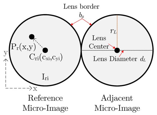 Figure 6 contains two adjacent micro-images. The border , and of the micro-images are defined in number of pixels. Raytrix R5 [] camera has the of 1 pixel. The modified algorithm defines valid pixels in a micro-image which are those that lie within the border of the micro-lens. The reference pixel is placed inside the reference micro-image whose center is at . The point is considered valid only if this condition holds true: