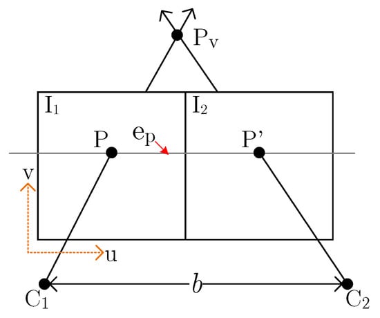 Best-match computation (BMC) involves finding the correspondence of valid census transformed reference pixel in target micro-images with a minimum error. This leads to the multi-view stereo problem, because every point of interest is projected by several micro-lenses. Correspondence is searched for a given of a reference micro-image in target micro-images . To save computation costs, search is restricted by matching only target pixels that lie on the epipolar lines within the neighborhood micro-images. Since the micro-lenses in the MLA are rectified and their respective planes are parallel, the epipolar line of a stereo pair is parallel to the b, as shown in Figure 7. A virtual point is projected on two adjacent micro-images planes and , at P and P’, with centers and respectively.