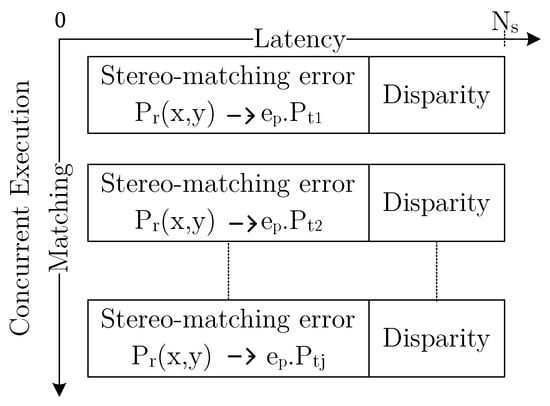 From Figure 11, it is clear that matching process is recursive in nature. It therefore enables the proposed design to use the spatial parallelization, as depicted in Figure 12. Each correlation with target micro-image pixel computes error of stereo-matching and corresponding disparity. If the latency of each comparison is clock cycles, the total latency to finish the matching process of hardware which ensures concurrency is ideally clock cycles.