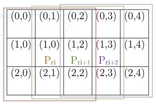 Census transform used in the design is adapted to exploit parallelization. Figure 13 shows a segment of an image where pixels are arranged in rows and columns (3 × 5). In this case, window size for the census transform is set to: M × M = 3 × 3. The process starts by selecting center pixel that is correlated with the surrounding pixels within the respective window. In the next iteration, window shifts to right and the next center pixel is selected and process goes on. These windows are represented by dotted lines and distinct colors. This process is completely pipelined in the proposed design, which allows iterations to run concurrently. Moreover, in hardware design, resource usage is optimized by using the arbitrary width data type. The corresponding number of bits is set to: . The inter-iteration dependencies are resolved by using a buffer of depth to store the bit comparison results during the correlation process.